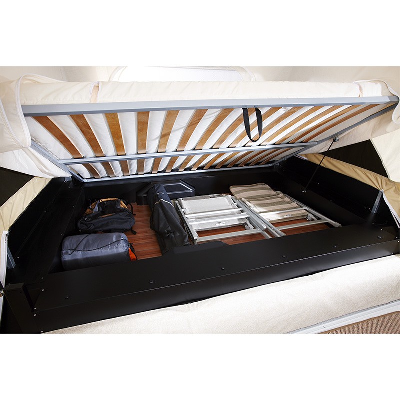Im Handumdrehen schaffen Sie einen sehr hellen Wohnraum, dank der großen Öffnungen an der Frontwand und der seitlichen Türen mit Moskitonetzen. Der Schlafbereich wahrt Ihre Privatsphäre und bietet absoluten Komfort. Eine breite Schlaffläche mit Lattenrost und einer Matratze mit Polsterüberzug warten auf Sie.