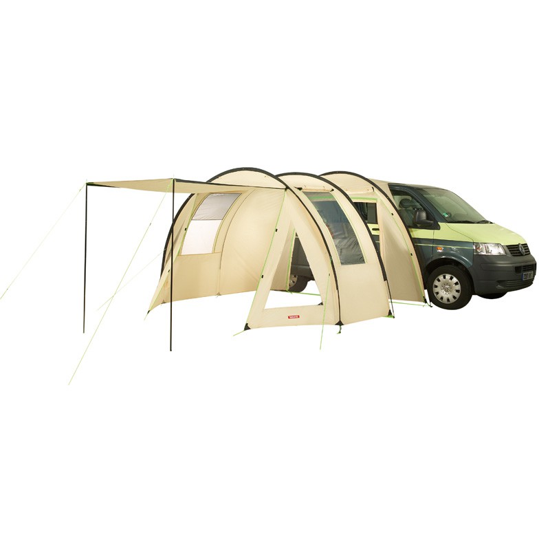 Onafhankelijke voortent voor kampeerbussen en minibussen - Ultralichte polyester opbergtunnel met een zij-ingang en 2 ventilatie-openingen aan de zijkant met muggengaas en luiken - Afdekking aan de achterkant die als bevestigingsluis op het voertuig dient